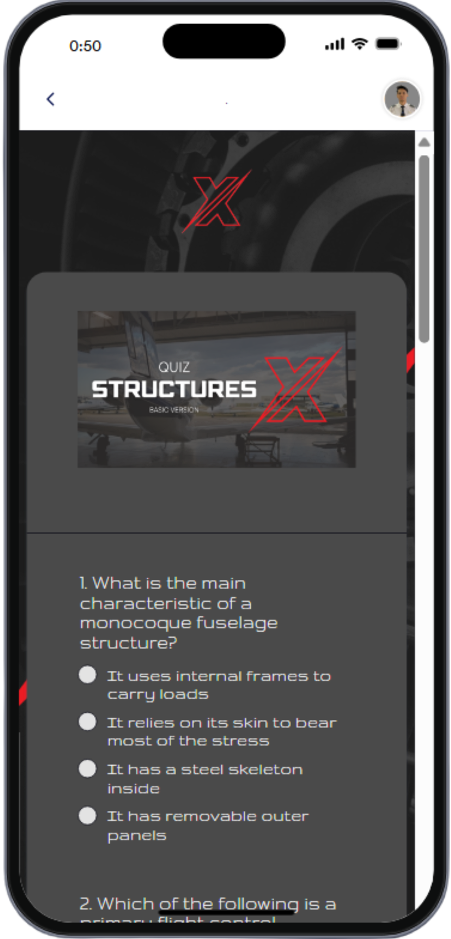 ABOUT US AviateX is a learning app for aviation students and enthusiasts. It makes aviation easier with 3D models, digital notes, and modules on avionics, structures and powerplant. Learn anytime, anywhere and track your progress with quizzes. PROBLEMS STATEMENT UNENGAGING CONTENTLIMITED FLEXIBILITYTECHNOLOGY GAP PRODUCT OBJECTIVES Enhance Aviation EducationPromote Visual LearningEncourage Self-Paced Learning PRODUCT FEATURES USER-FRIENDLY INTERFACEFEATURES AVIONICS, STRUCTURES & POWERPLANTENHANCED 3D MODELSUSER PROGRESS TRACKING PRODUCT OVERVIEW